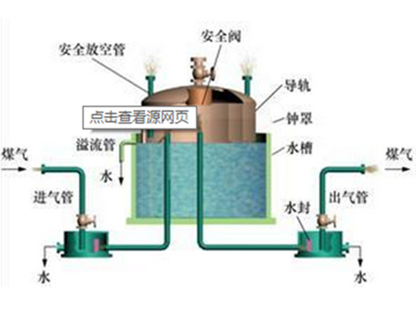 鐘罩和柜壁之間的縫隙靠水密封、鐘罩靠柜內(nèi)介質(zhì)壓力變化上下浮動(dòng),恒壓濕式氣柜的壓力通過鐘罩上的平衡塊數(shù)量的多少來調(diào)節(jié)。