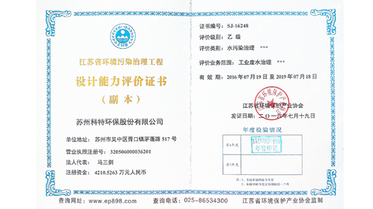 6月5日,科特環(huán)保向江蘇省環(huán)境保護(hù)產(chǎn)業(yè)協(xié)會(huì)提交了“江蘇省環(huán)境污染治理工程設(shè)計(jì)能力評(píng)價(jià)”、“江蘇省環(huán)境污染治理工程總承包能力評(píng)價(jià)”及“江蘇省環(huán)境污染治理能力評(píng)價(jià)”三項(xiàng)資質(zhì)證書…