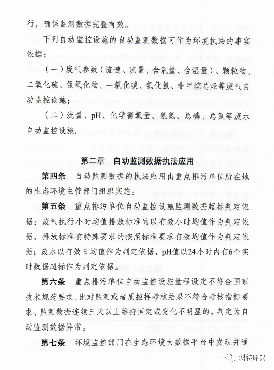 下列自動(dòng)監(jiān)控設(shè)施的自動(dòng)監(jiān)測(cè)數(shù)據(jù)可作為環(huán)境執(zhí)法的事實(shí)依據(jù):(—)廢氣參數(shù)(流速、流量、含氧量、含濕量)、顆粒物、二氧化硫、氮氧化物、一氧化碳、氯化氫、非甲烷總烴等廢氣自動(dòng)監(jiān)控設(shè)施;(二)流量、pH、化學(xué)需氧量、氨氮、總磷、總氮等廢水自動(dòng)監(jiān)控設(shè)施。