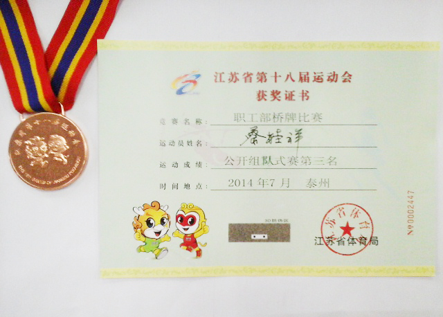 7月20-26日,江蘇省第十八屆運(yùn)動(dòng)會(huì)職工部橋牌比賽在泰州市舉行,應(yīng)蘇州市總工會(huì)邀請(qǐng),我公司職工蔡桂祥代表蘇州市參賽。經(jīng)過(guò)激烈角逐,蘇州代表隊(duì)獲得了團(tuán)體第三名的好成績(jī),蔡桂祥個(gè)人獲得公開(kāi)組隊(duì)式賽第三名的好成績(jī)。